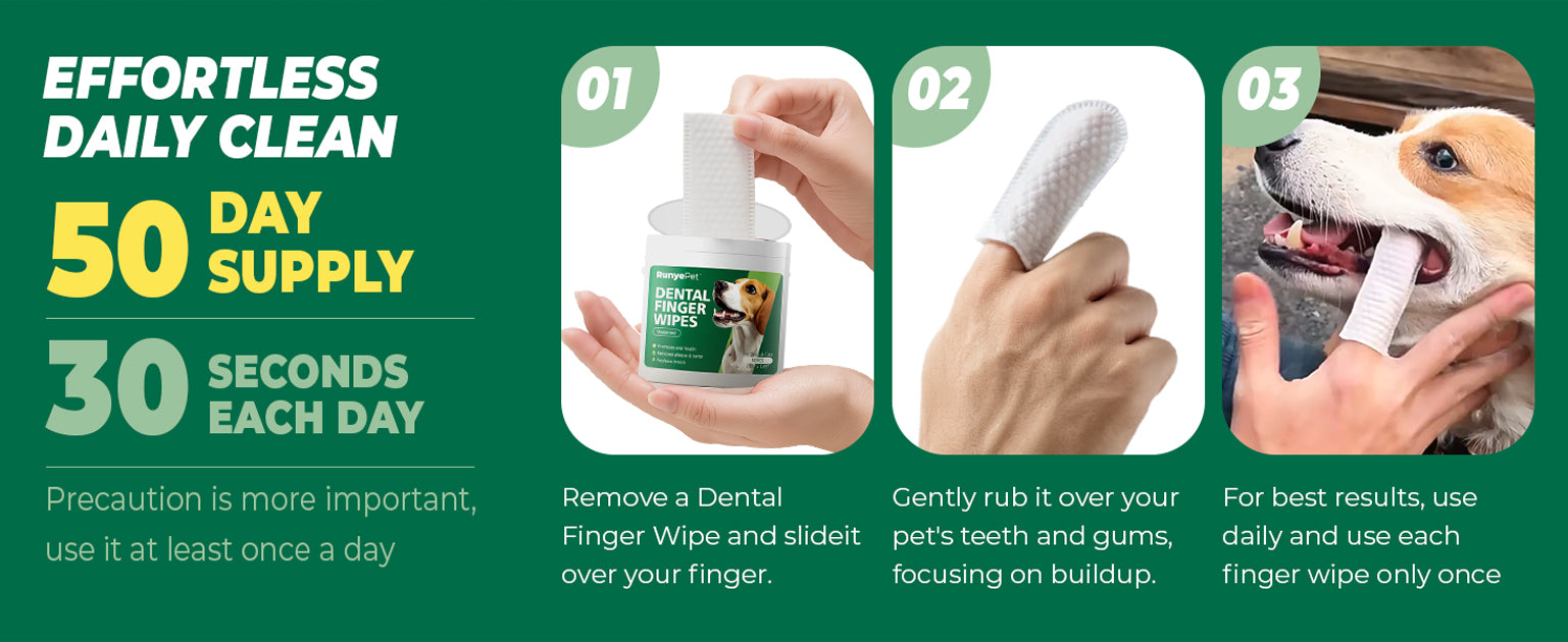 Using our Larger Size Upgraded Pet Dental Finger Wipes for Dogs and Cats is quick and straightforward. Just follow these simple steps for the best results: